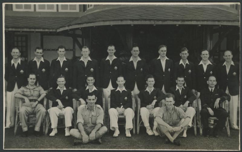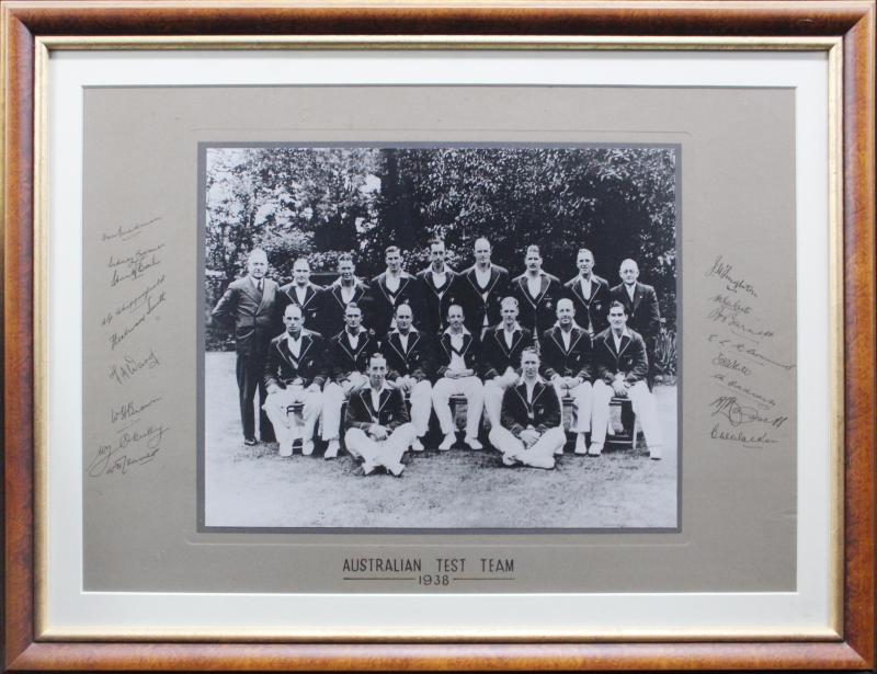 1938 Australian Team superb large team photograph 'Australian Test Team 1938' showing Australian team in their Australian blazers, with 17 signatures on the mount - Don Bradman (captain), Sidney Barnes, Stan McCabe, Arthur Chipperfield, Chuck Fleetwood-Smith, Frank Ward, Bill Brown, Bill O'Reilly, WH Jeanes (manager), Jack Fingleton, Merv Waite, Ben Barnett, Ernie McCormick, Ted White, Jack Badcock, Lindsay Hassett & Charlie Walker, archivally framed & glazed, overall 72x55cm. (Image1)