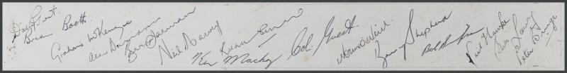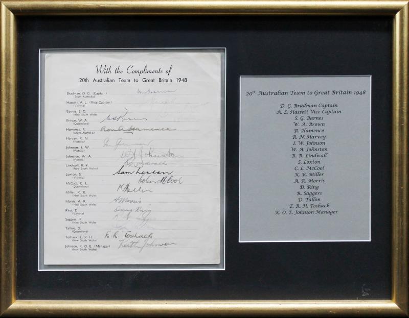 1948 Australian Team official team sheet with 17 signatures - Don Bradman, Lindsay Hassett, Bill Brown, Ron Hamence, Neil Harvey, Ian Johnson, Bill Johnston, Ray Lindwall, Sam Loxton, Colin McCool, Keith Miller, Arthur Morris, Doug Ring, Ron Saggers, Don Tallon, Ernie Toshack & Keith Johnson (manager); plus the hand-stamp of Sid Barnes (couple of signatures fading), window mounted with list of players names, archivally framed & glazed, overall 44x34cm. (Image1)