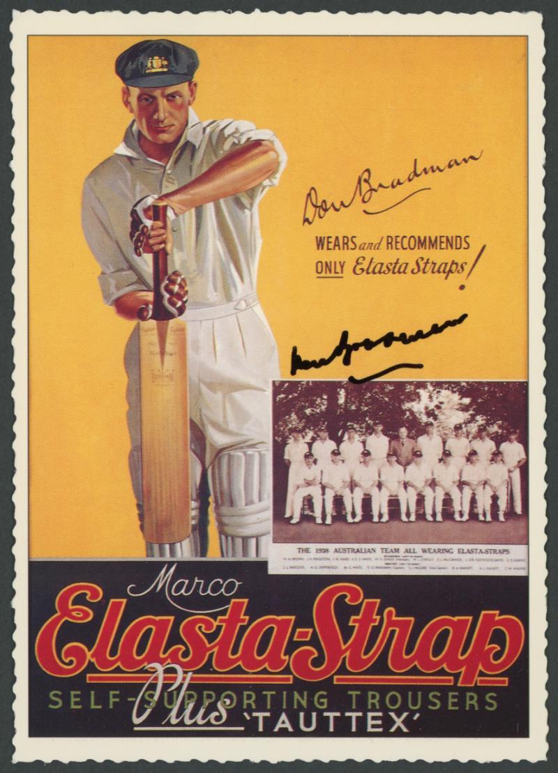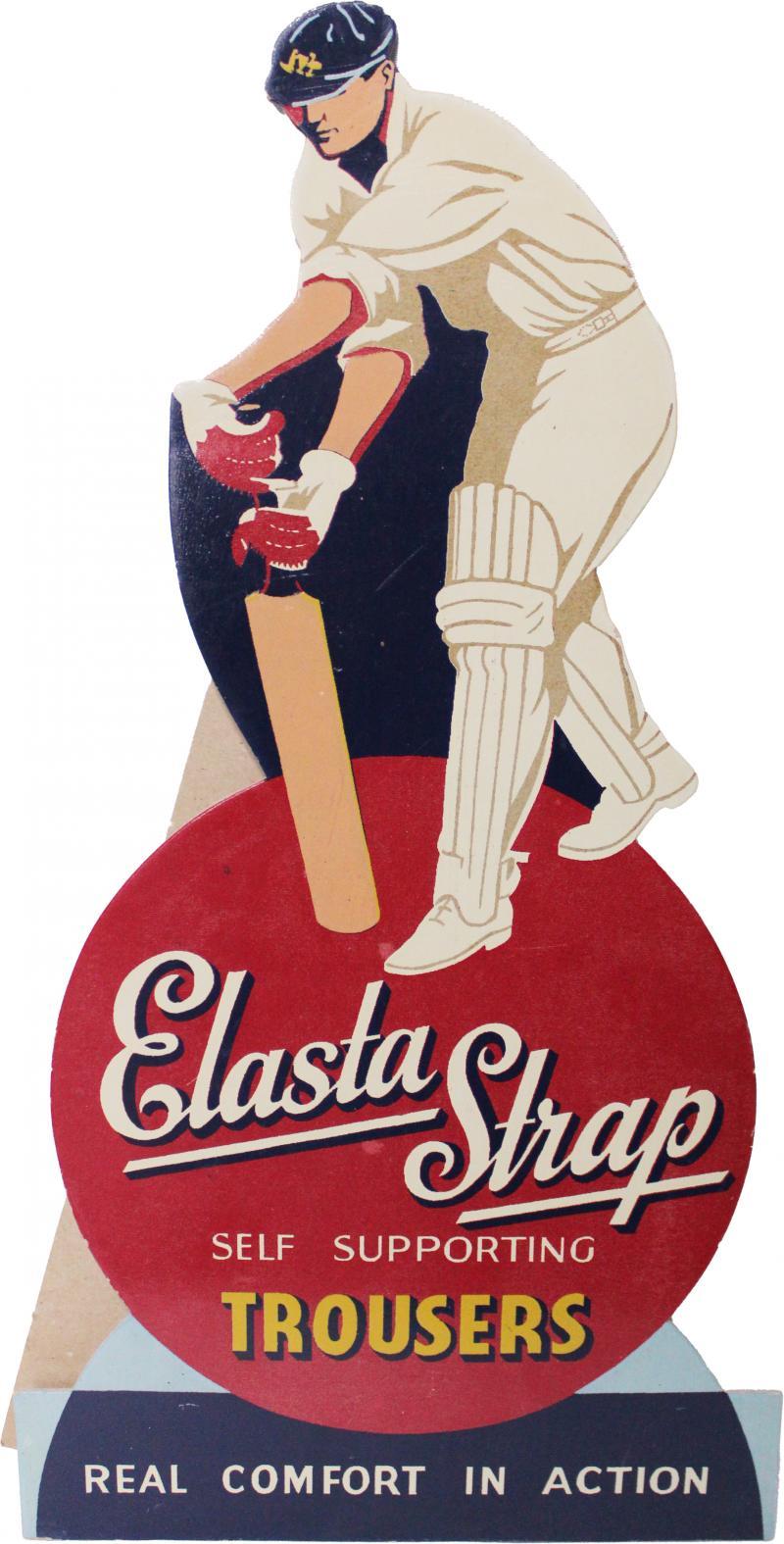 Advertising Sign showing batsman wearing 'Baggy Green' Cap 'Elasta Strap Self Supporting Trousers, Real Comfort in Action', 42cm tall, superb condition. (Image1)