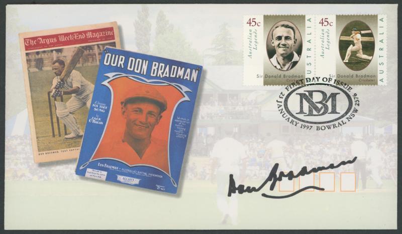 DON BRADMAN: Ephemera collection in album, comprising publicity pictures (8) all signed; 1995 Sanitarium 'The Bradman Collection' brochures (14 - 4 signed) & packets (2 - both signed); Bradman Museum/Foundation membership tickets (9) one signed; Bradman Collection tickets (4 - 3 signed); Bradmania stickers (3) & signed bookmark; 1997 Australian Legends - Don Bradman FDC signed; brochures (6) all signed, mainly Fine/Very Fine.