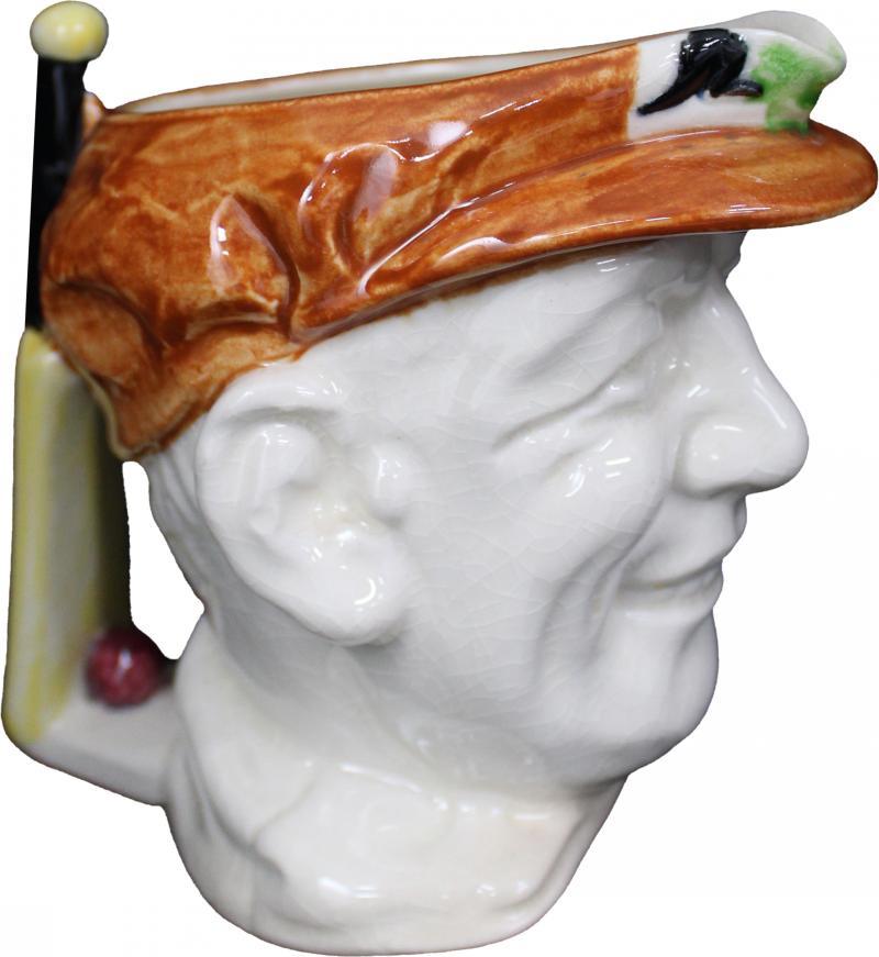 DON BRADMAN: 1934 large toby jug with cap in green, made in Japan by Marutomo, 15cm high, Fair/Fine condition (small cracks). (Image1)