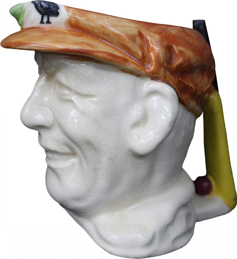 DON BRADMAN: 1934 large toby jug with cap in brown, made in Japan by Marutomo, 15cm high, Fair/Fine condition (repair to top of bat). (Image1)