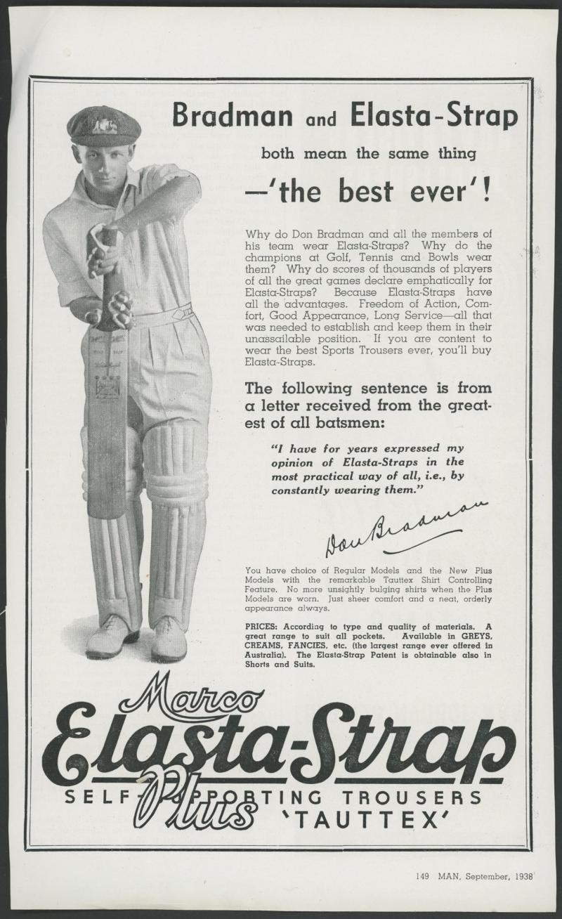 DON BRADMAN: 'Souvenir Programme, British Empire Games of 1938, Sydney Australia' with advert on back cover "Two Australian Champions, Don Bradman and Peters Ice Cream"; plus page with advert "Bradman and Elasta-Strap", mainly Fair/Fine.