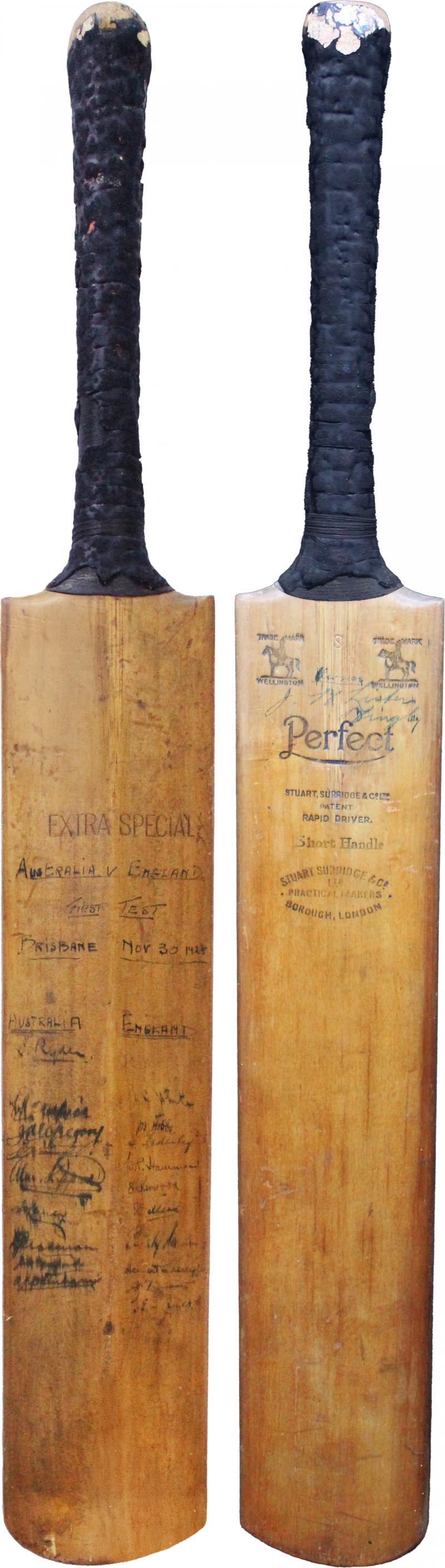 DON BRADMAN - FIRST TEST: 'Stuart Surridge & Co' cricket bat endorsed on reverse 'Australia v England, First Test, Brisbane Nov 30th 1928' signed by 9 Australians - Jack Ryder, Bert Oldfield, Jack Gregory, Clarrie Grimmett, Alan Kippax, 'Stork' Hendry, Don Bradman, Bill Ponsford & Ron Oxenham; plus 10 Englishmen - Jack White, JB Hobbs, Ernest Tyldesley, Walter Hammond, Harold Larwood, Phil Mead, Patsy Hendren, Herbert Sutcliffe, Percy Chapman & Les Ames. Bat varnished and Australian signatures have bled, though all still legible. An historic signed bat. [Bradman had a disappointing Test with 18 & 1 as Australia lost by 675 runs. He was dropped for the 2nd Test, and then re-appointed for the 3rd Test where he scored his maiden Test century. That was followed shortly after by a score of 452 not out for NSW]. (Image1)