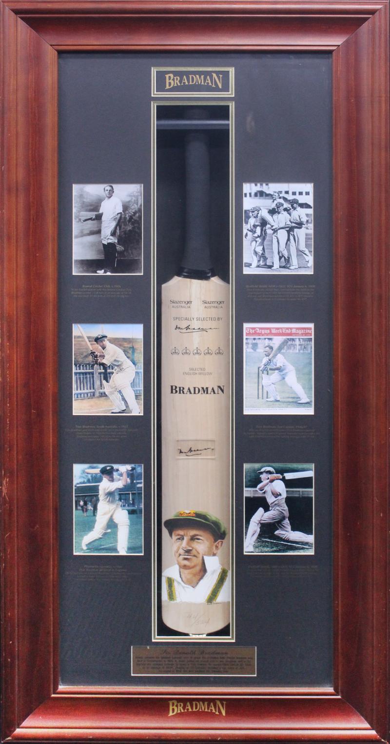 DON BRADMAN: 'Slazenger - Bradman' cricket bat with hand-painted portrait, with Don Bradman signature affixed to front, limited edition 44/334, in attractive display case, overall 56x118cm. With CoA from Bradman Museum. (Image1)