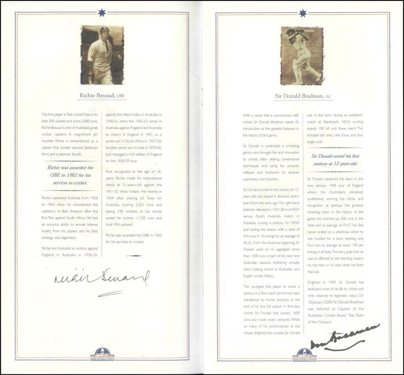 Autographs 2000 'Sydney Cricket Ground Life Members Induction Ceremony' booklet with 16 signatures including Don Bradman, Richie Benaud, Bill Brown, Betty Cuthbert, Alan Davidson & Keith Miller; plus 3 photographs, Superb condition. (Image1)