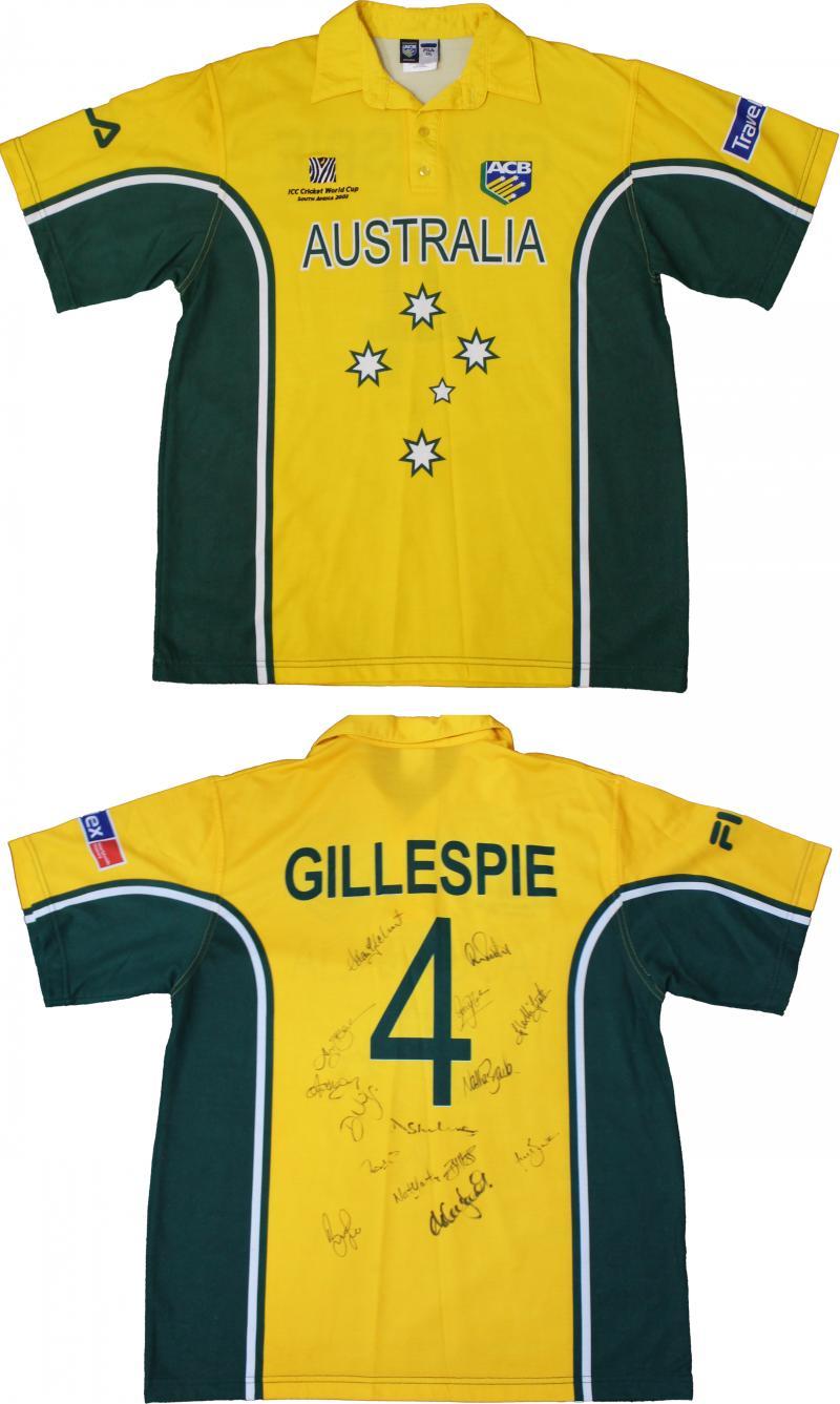 Clothing 2003 Australian ODI Shirt with 'GILLESPIE' & '4' on reverse, ACB logo & 'ICC CRICKET WORLD CUP, SOUTH AFRICA 2003' on front, with 15 signatures on reverse including Ricky Ponting, Adam Gilchrist, Andy Bichel & Nathan Hauritz. Ex Jason Gillespie collection. (Image1)