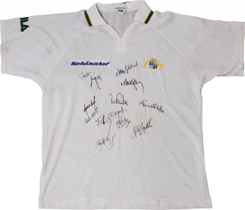 Clothing 2001 Australian Test Shirt with embroidered Australian Coat-of-Arms and Kelvinator & Fosters logos, match worn with 'INDIA 2001' on collar & 'DIZ' on tag with 13 signatures of the Australian Team including Steve Waugh, Matthew Hayden, Glenn McGrath & Jason Gillespie. Ex Jason Gillespie collection. (Image1)