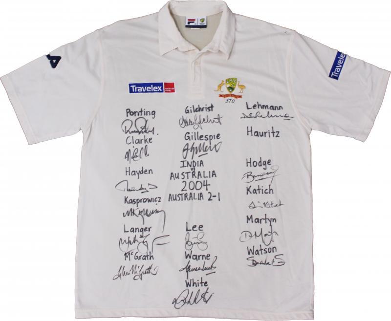 Clothing 2004 Australian Test Shirt with embroidered CA Coat-of-Arms, '370', and Travelex & FILA (with JG below) logos, match worn, endorsed on front 'INDIA vs AUSTRALIA 2004. AUSTRALIA 2-1' with 16 signatures including Ricky Ponting, Adam Gilchrist, Michael Clarke & Simon Katich. Ex Jason Gillespie collection. (Image1)