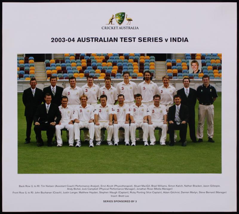 Photographs Australian colour team photographs with title & players names on mount, collection comprising 2003 v Bangladesh, 2003 ODI v Bangladesh, 2003 v Zimbabwe, 2003-04 v India, 2003-04 ODI v Zimbabwe & India, 2004 Tour of Sri Lanka, 2004 ODI Tour of Sri Lanka, 2004 ODI Tour of Zimbabwe, all 35x33cm, Superb condition. Ex Jason Gillespie collection.