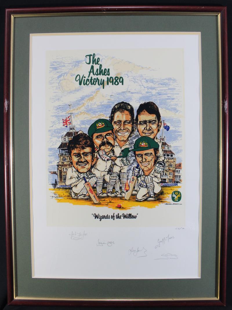 Prints comprising 'The Ashes Victory 1989' set of three prints with a total of 13 signatures including Allan Border, Mark Taylor, Steve Waugh, Dean Jones & Terry Alderman; plus 'The Victors 1989' (mount with water staining), various sizes, mainly Fair/Fine.