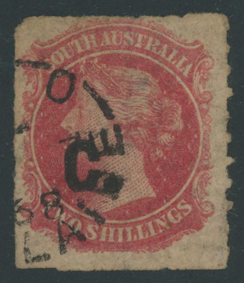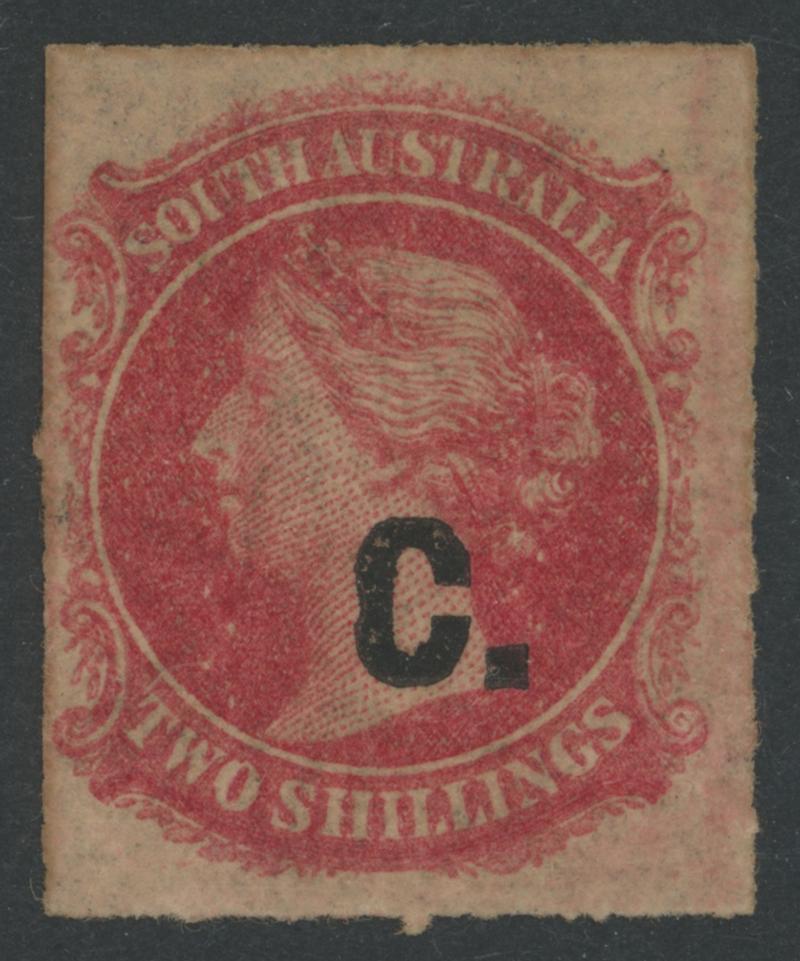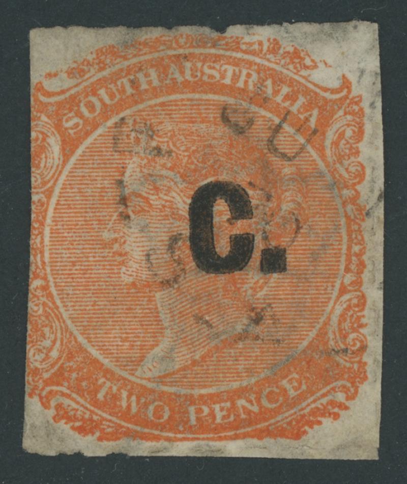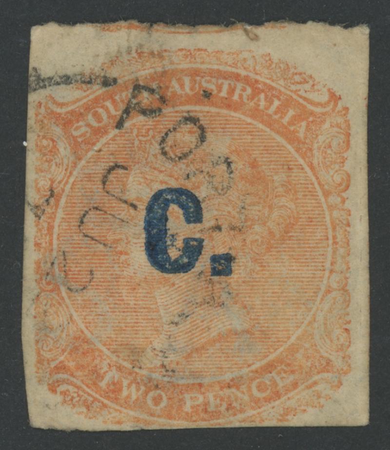 BLUE OVERPRINT: 'C.' on QV De La Rue Crown/SA Wmk Rouletted 2d light orange SG DO71, from the base of the sheet with horizontal marginal watermark line at the base, rouletting at top & right but cut from the sheet on three sides to preserve the design, shallow thin at the base, light Port Adelaide cds of 'JU28/70', Cat £450. Rated RRRR. Ex Vic Bullock: sold for $755 (Sale 130 Lot 419). RPSV Certificate (2007). Don Pearce's very fine example sold for $750 (Sale 247 Lot 220). Absent from 'Besancon'. [Date 1.6.1869 to 28.6.1870] (Image1)