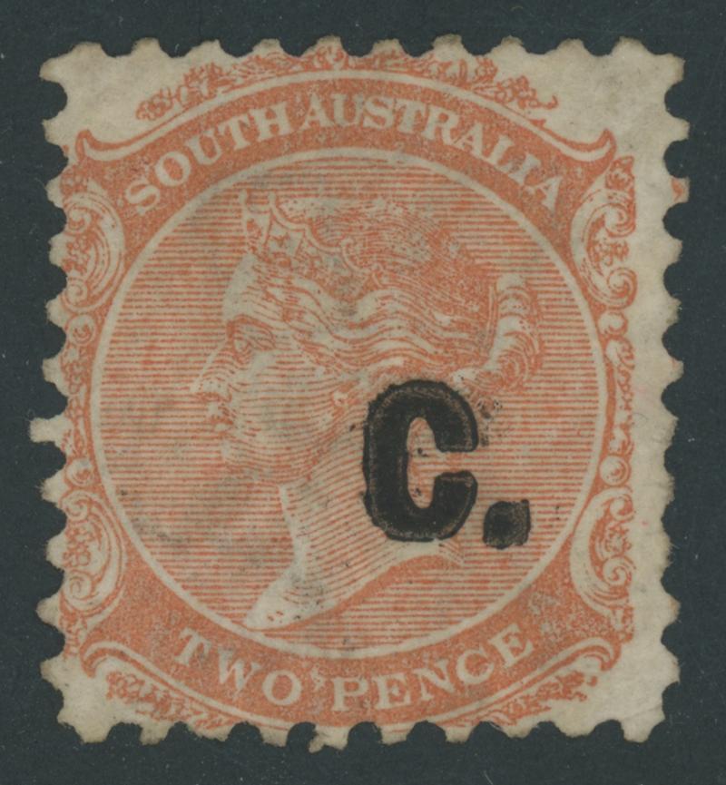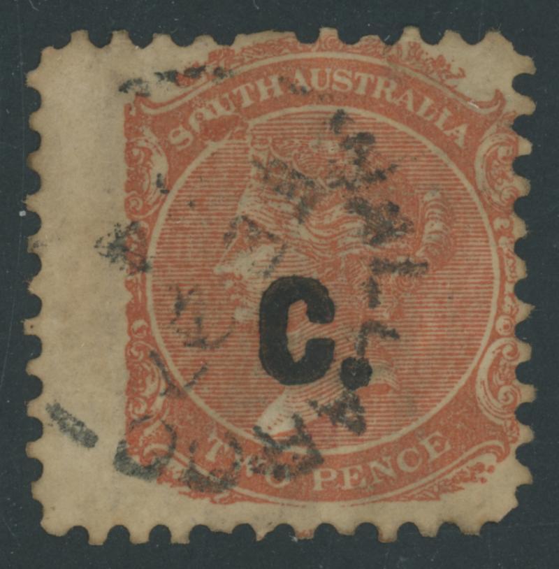 BLACK OVERPRINT: 'C.' on QV De La Rue Crown/SA Wmk Perf 10xRouletted 2d dull orange SG DO83, light Port Adelaide cds of 'JA1/71', Cat £450. Grossly underrated at R. Don Pearce's very fine example sold for $715 (Sale 247 Lot 231). [Date range 21.7.1870 to 11.10.1871] (Image1)