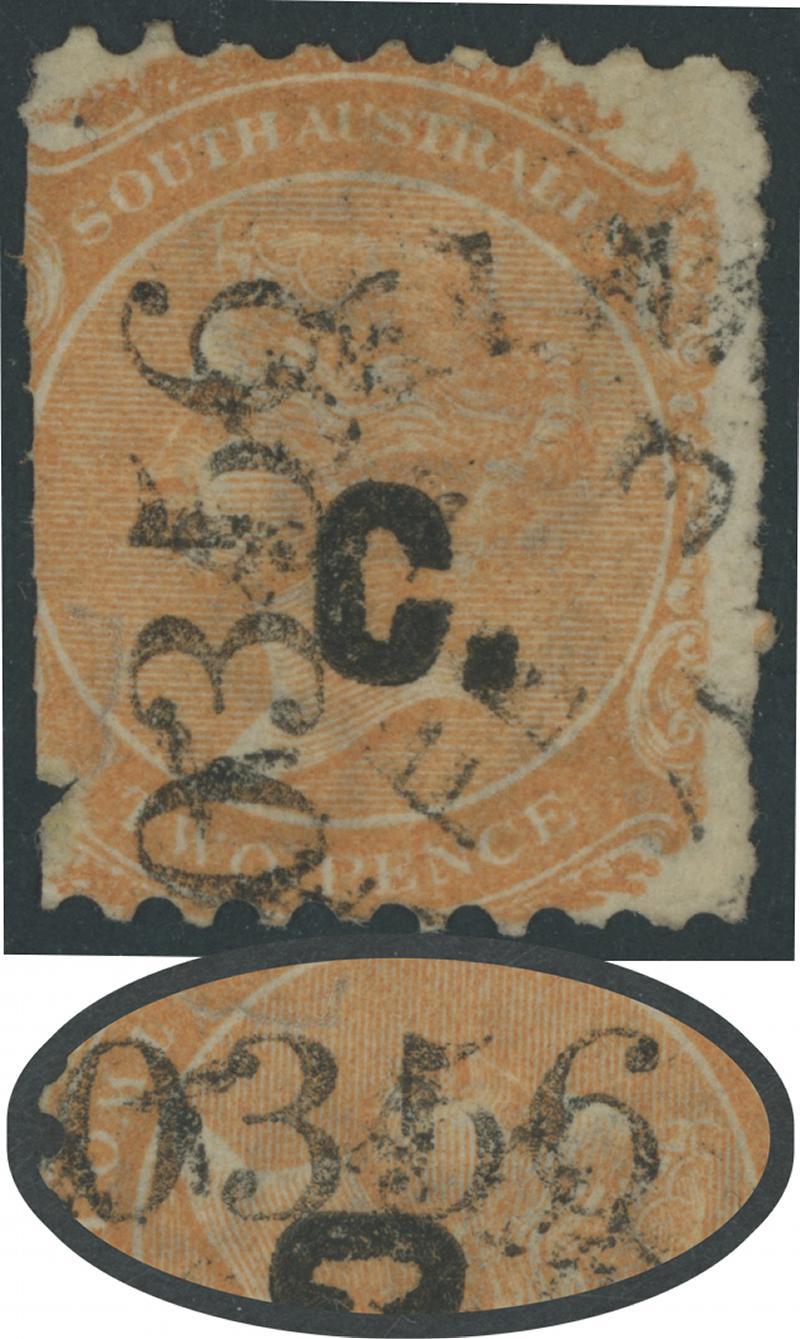 BLACK OVERPRINT: 'C.' on QV De La Rue Crown/SA Wmk Irregular Compound Perf 10x10x11½-12½x10 2d dull orange SG DO89, most unusually with Sheet Number Printed on the Face, small fault at left, Port Adelaide cds of 'FE3/71'. Rated R+. Ex Don Pearce: sold for $263 (Sale 247 Lot 232). The only such error we have seen on a Departmental stamp. (Image1)