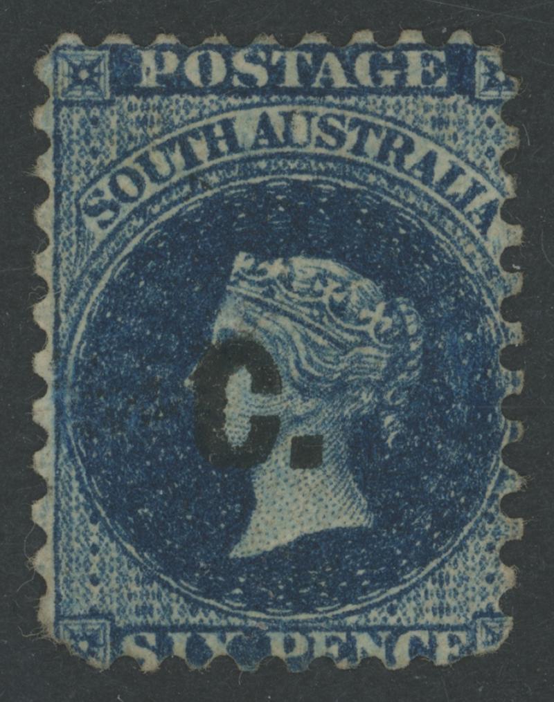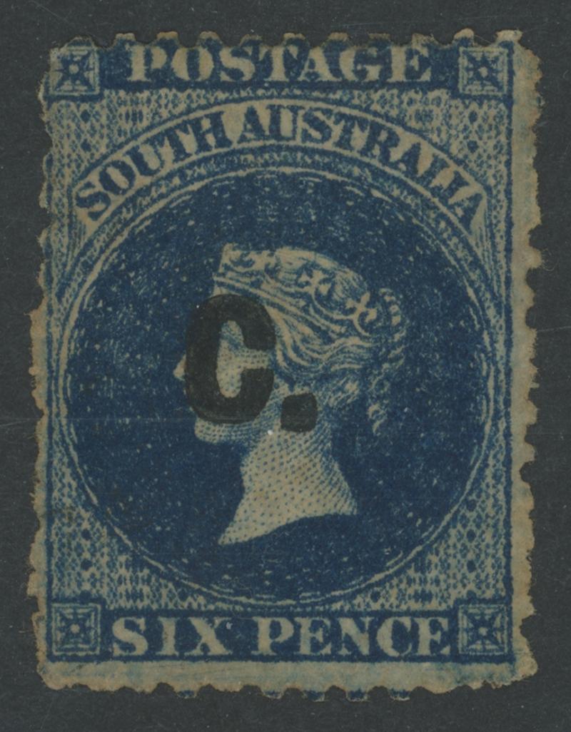 BLACK OVERPRINT: 'C.' on QV Perkins Bacon Large Star Wmk Rouletted 6d as SG DO77 but in dull blue, rouletting on all sides, slightly trimmed at upper-left, a little aged, light Port Adelaide cds of 'AU14/71'. An enigma. Gibbons and Ron Butler record the Black Overprint 6d rouletted in Prussian blue only. There was a 6d dull blue with Blue Overprint (unrecorded used), but the overprint here is definitely black. Offered 'as is'. (Image1)