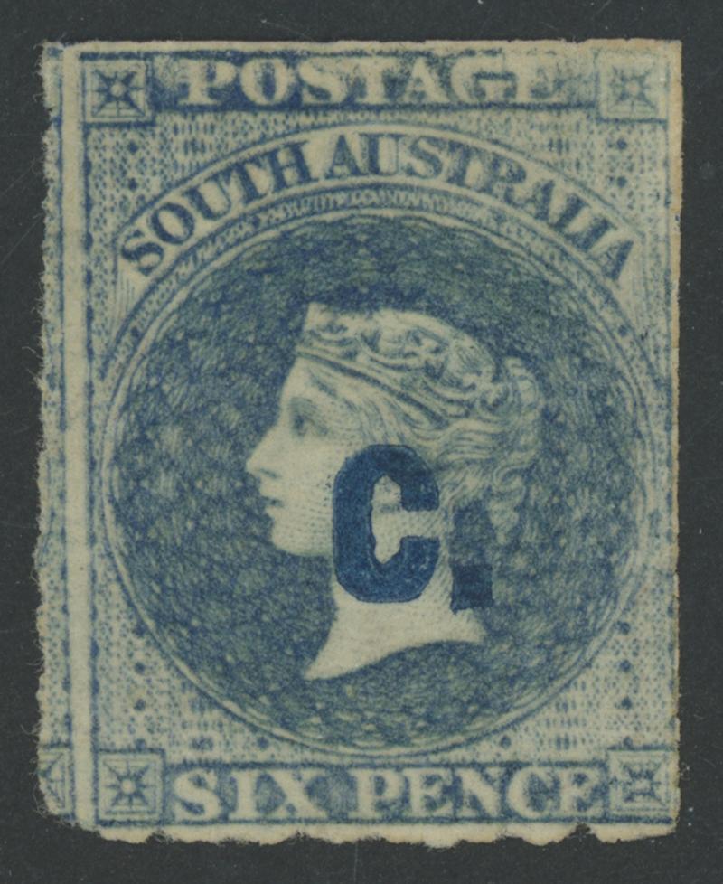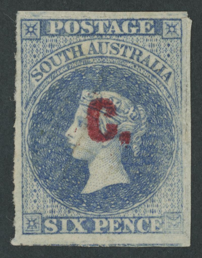 BLUE OVERPRINT: 'C.' on QV Perkins Bacon Large Star Wmk Rouletted 6d dull blue SG DO73, rouletting at top & base and misplaced into the design at left (largely separated & reinforced) so cut from the sheet at the sides to preserve the design, light Port Adelaide cds of 'MY10/69', Cat £1500. Without the rejoined portion, the stamp would be graded 'A', but not be anywhere near as attractive. Unrecorded used by Ron Butler, and only one other example known, so it should be rated RRRRR. Sold at a Sydney auction in 2021 for $1275. Don Pearce's very fine example sold for $2395 (Sale 247 Lot 223). Absent from 'Besancon'. [Date range 10.5.1869 to 1.6.1869 only] (Image1)