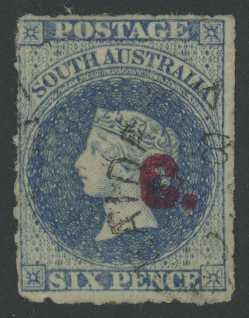 RED OVERPRINT: 'C.' on QV Perkins Bacon Large Star Wmk Rouletted 6d dull ultramarine SG DO67, rouletting on three sides and cut from the sheet at right well clear of the design, light Port Adelaide 1868 cds, under-catalogued at £200. Rated RR. Ex 'Besancon': sold for SFr785. Chris Ceremuga Certificate (2018) states "very rare". The 'Tamiami' and Don Pearce examples sold for a mere $311 (Sale 236 Lot 584) and $300 (Sale 247 Lot 216) respectively. [Date range 30.4.1868 to 8.12.1869] (Image1)