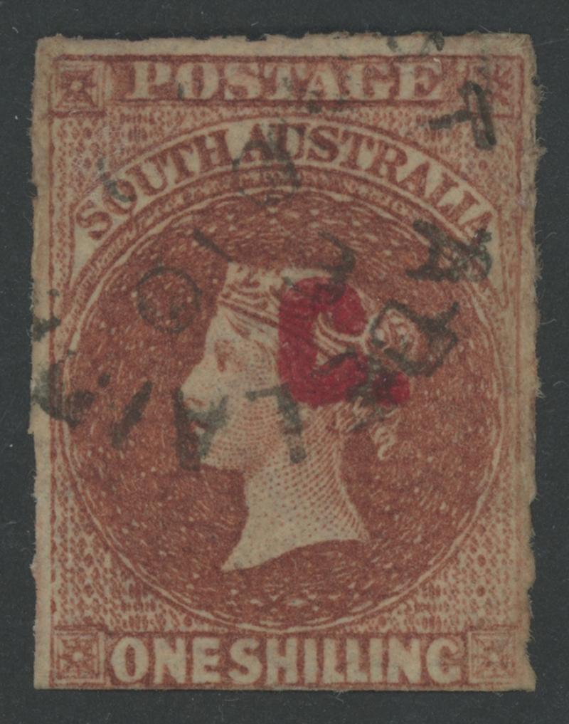RED OVERPRINT: 'C.' on QV Perkins Bacon Large Star Wmk Rouletted 1/- red-brown SG DO68, rouletting on three sides and cut from the sheet at base just clear of the design, light Port Adelaide cds of 'NO10/ ? ', Cat £500. Rated RRRRR. Ex 'Besancon': sold for SFr410. Chris Ceremuga Certificate (2018) states "extremely rare". Don Pearce's example sold for $1195. (Image1)
