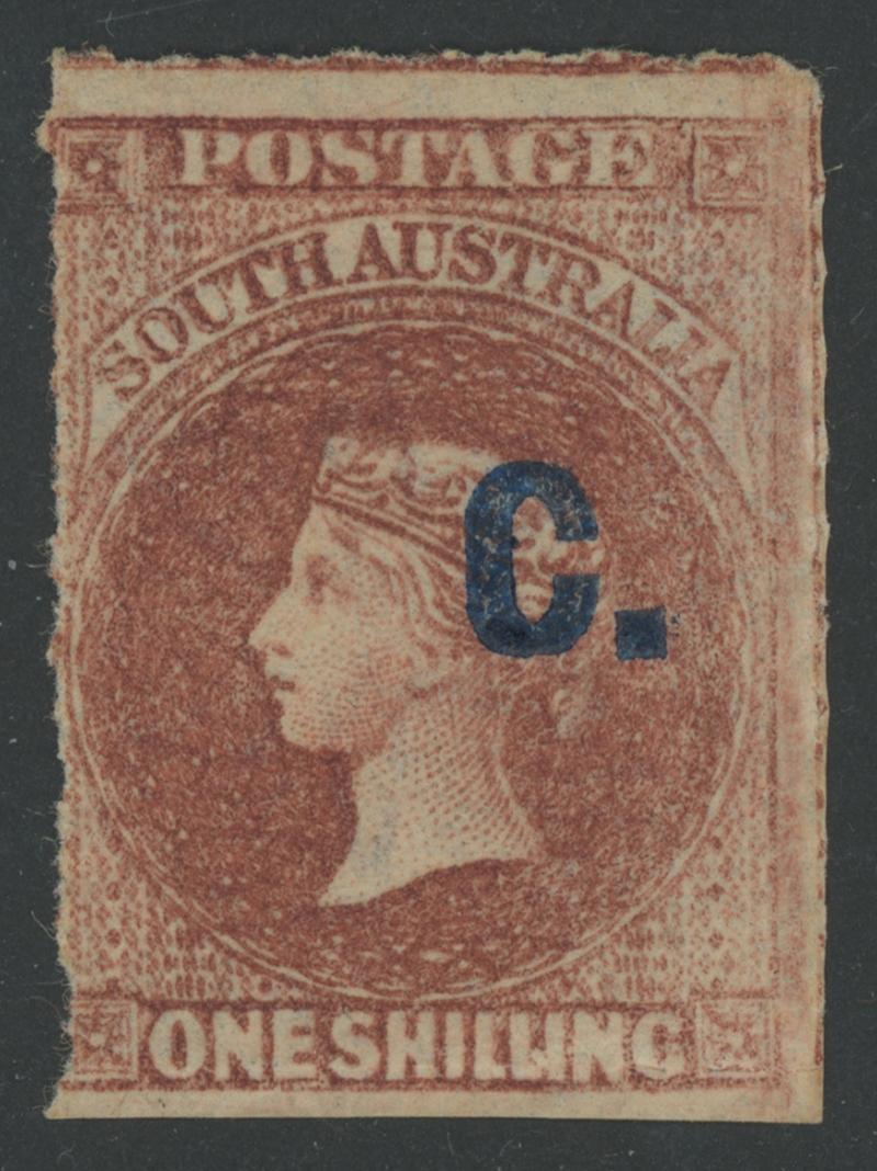 BLACK OVERPRINT: 'C.' on QV Perkins Bacon Large Star Wmk Perf 11½-12½xRouletted 1/- red-brown (from the worn plate), light Port Adelaide cds with indistinct date. Unlisted by Gibbons, surely an oversight. Grossly underrated at R; unrecorded unused by Ron Butler. Don Pearce's example sold for $1255 (Sale 247 Lot 244). Absent from 'Besancon'. [Date range 23.5.1870 to 5.4.1872] (Image1)