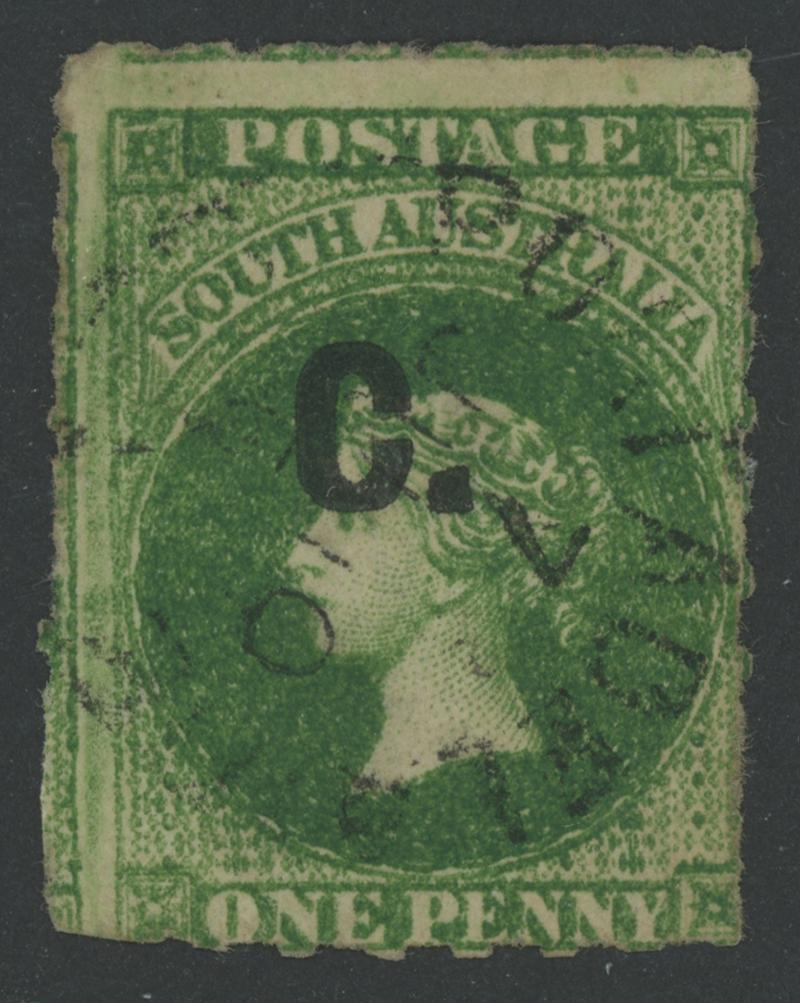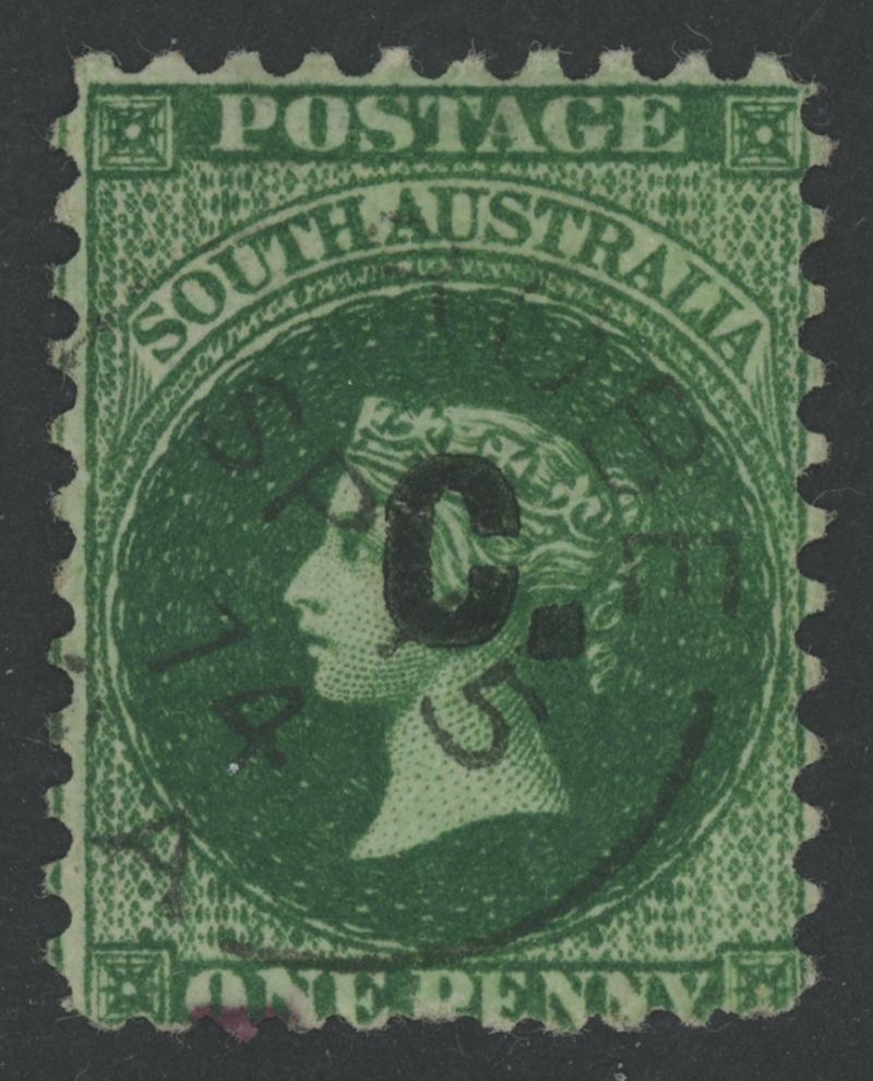 BLACK OVERPRINT: 'C.' on QV Perkins Bacon Large Star Wmk Rouletted 1d green SG DO75, rouletting on all sides, light Port Adelaide cds of 'JU10/74', Cat £225; unpriced unused. Rated RR; unrecorded unused. Ex Victor Bullock: sold for $315 (Sale 130 Lot 421). Don Pearce's similar example sold for $360 (Sale 247 Lot 226). [Date range 4.10.1872 to 1.4.1875] (Image1)