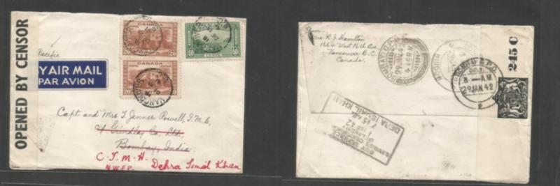 Canada. 1941 (Dec 13) Vancouver, BC - India, Bombay, fwded Dehra (1 Feb 42) Air multifkd env reverse censored arrival via Pacific South Tasmanian Clipper, at 90c rate, tied cds + travel time 45 days. (Image)