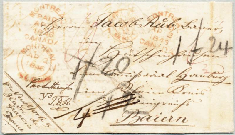 1846, prephilatelic letter from BERLIN/Ontario/Canada to HAMBURG/Germany via MONTREAL, NEW YORK, LE HAVRE and PARIS, bearing red MONTREAL datestamps (April 2, 1846, April 3 and PAID April 3), red LE HHAVRE transit and charge marks for 4 1/2 Canadian inland, 10 (Cts.) US inland rate to NEW YORK and 1 (Guilder/Gulden) and 27 (Kreuzers) in total for transatlantic ship fee to France and French transit (1 G. and 20 Kr.), Bavarian 4 (Kr.) and rural delivery 3 (Kr.), PARIS transit and red Homburg 9/5 arrival datestamp on reverse, the notarial letter, dated 20th March 1846, was sent by Christian Enslin, Public Notary Canada West to Jacob Rüb, farmer in Hütschenhausen, Rhine district, Bavaria, exceptionally rare letter showing the transatlantic post route between Canada and Bavaria, ex. Pietz collection, intriguing and unique, XF! Schätzpreis 4.000€. (Image)