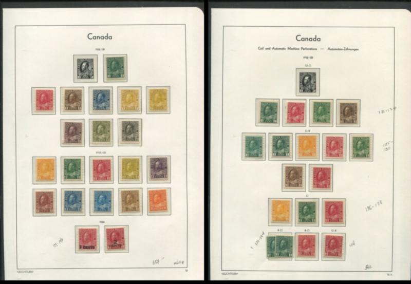 Canada 1912-1925, Admiral Issue, including Provisionals, imperfs and coils, MH, Unitrade $1200.00 USD $865.00, on Leuchiturm Album sheets, a lovely collection of this popular area, 1c to $1 including somne of the more difficult values, fresh colours (Image)