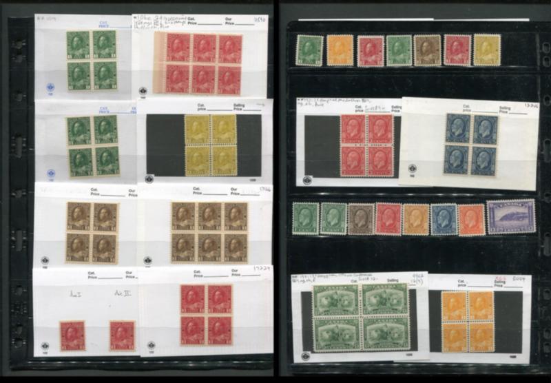 Canada 1903 - 1930 #90i/#172 Stamp Collection MNH Mint Cancelled F/VF. A collection of over 300 stamps, Edward VII and George V, on 102's identified, along with 71 102 highlights of the collection, visible and identified on stock sheets., highlight examples include an imperf block of 4 of 390a, a MNH block of 6 of #105b, a nice group of MNH Admirals including #113, a strip of 4 #112, 112, 109 Die 1, 113, 115, 117,MNH blocks of 6 and 8 , #194, 119, 124, # 125 coil, a strip of 4 #128, #119, 118, 135, 120, 126 coils pair,127, 129, 131ii strip of 3 MNH, 138, 139, 140, 152, 164a,, and many many more nice stamps, mostly fresh and eye appealing. Unitrade value $9,000 ($6480 USD) (Image)