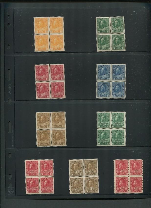 Canada 1911-1925 , #105d / # MR5, a MNH/MH group of nine blocks of four, Unitrade value $2340 cdn ($1708 USD) some faults, appears f-vf (Image)