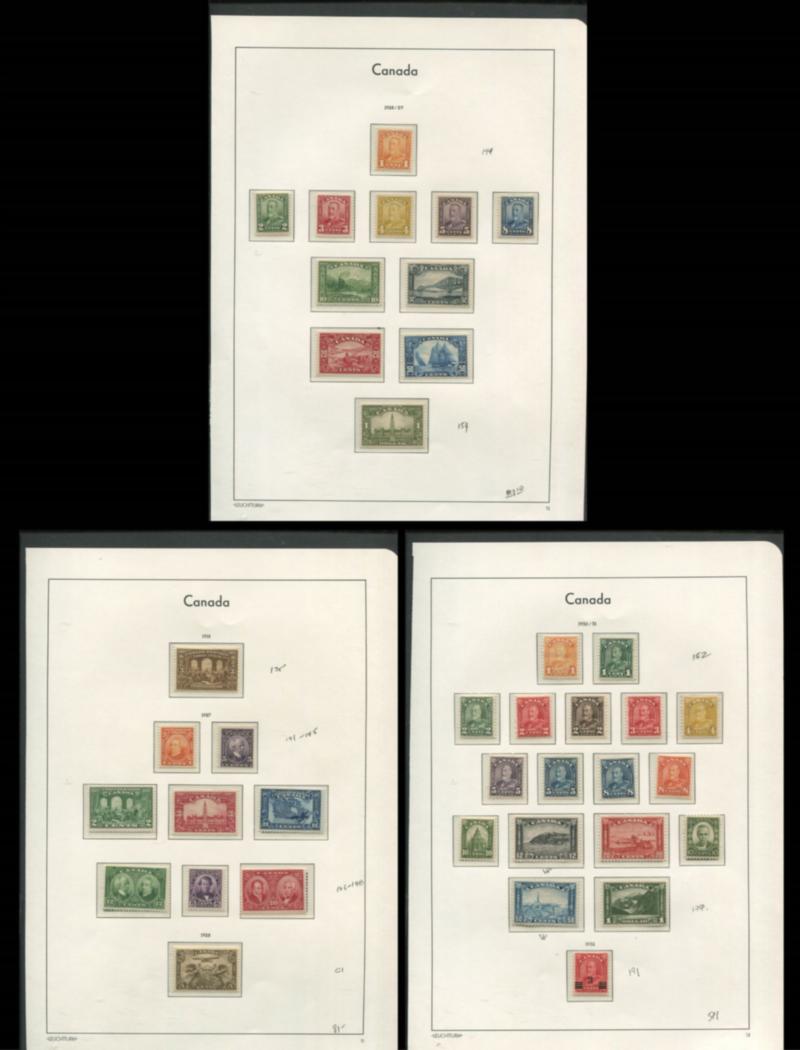 Canada 1911-1925, Admiral Issue, Unitrade $1704.00 USD $1225.00, on 3 rig Album sheets, mainly fine centering, mint hinged, including coils, imperf pairs, and Provisionals, a very nice group for this popular collecting area. (Image)