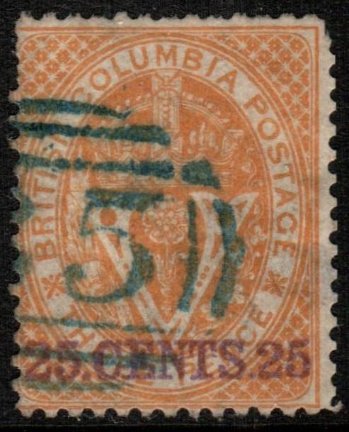 British Columbia & Vancouver Island Stamp (MiNr: 10c)- Surcharge (1869) 25¢ on 3d used. With #35 Numeral Cancel blue. (Image)