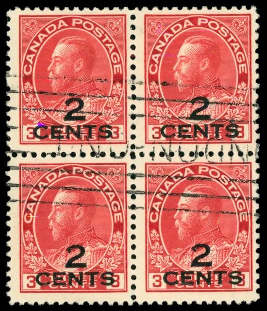 1926, King George V "Admiral", 2¢ on 3¢ carmine (Scott 140), block of 4, Fine to Very Fine. Scott $100. (Image)