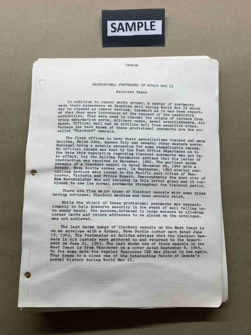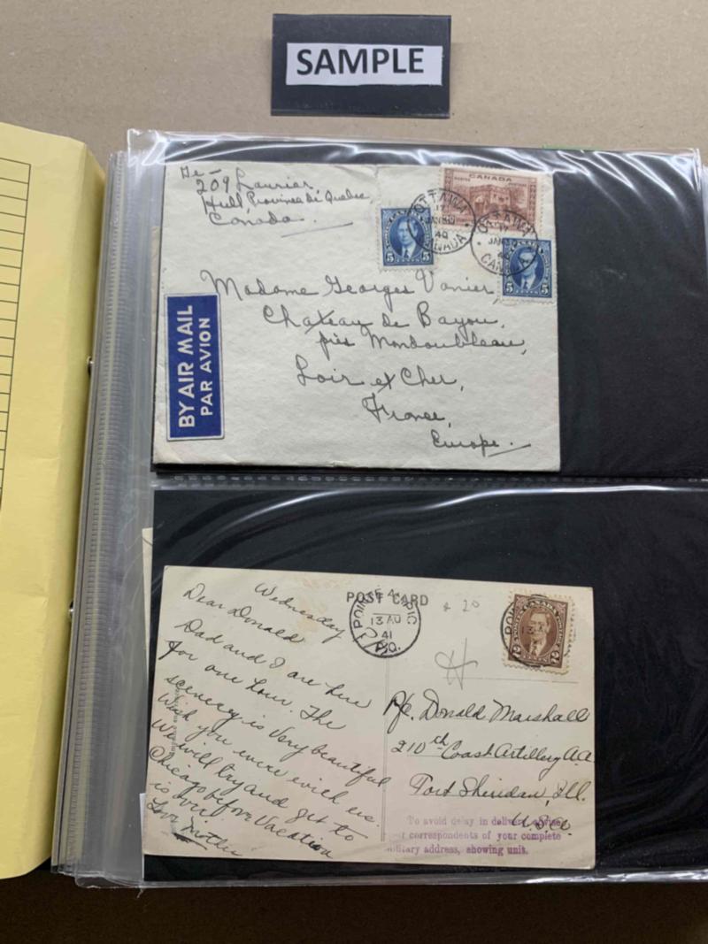 102 Mufti era covers and cards in soft padded album, spotted 1940 30¢ air to France, 1940 postcard "SALVED FRM THE SEA", 1937 5¢ to Sweden, 1943 4¢ single censored, blackout, 1939 35¢ air to Colombia, CNS Lady Hawkings Posted on the High Seas, etc. Not all images shown. See more images in PDF. Click here for PDF.(Image)