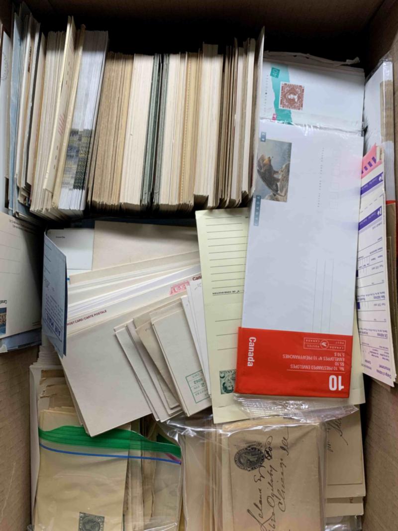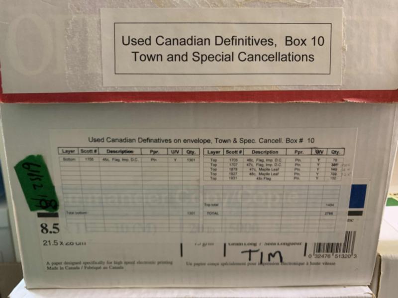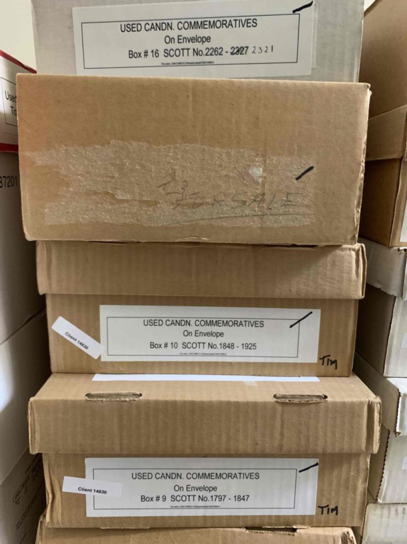 Canada definitive cover horde, #714/2138 in eight large photocopy paper boxes, all sorted and banded by catalogue number, even sub numbers such as tagging, booklet, perforation variety. Loads of machine cancel, special cancels etc. A huge supply for the modern specialist. Estimate 10,000+ covers. Not all images shown. See more images in PDF. Click here for PDF.(Image)