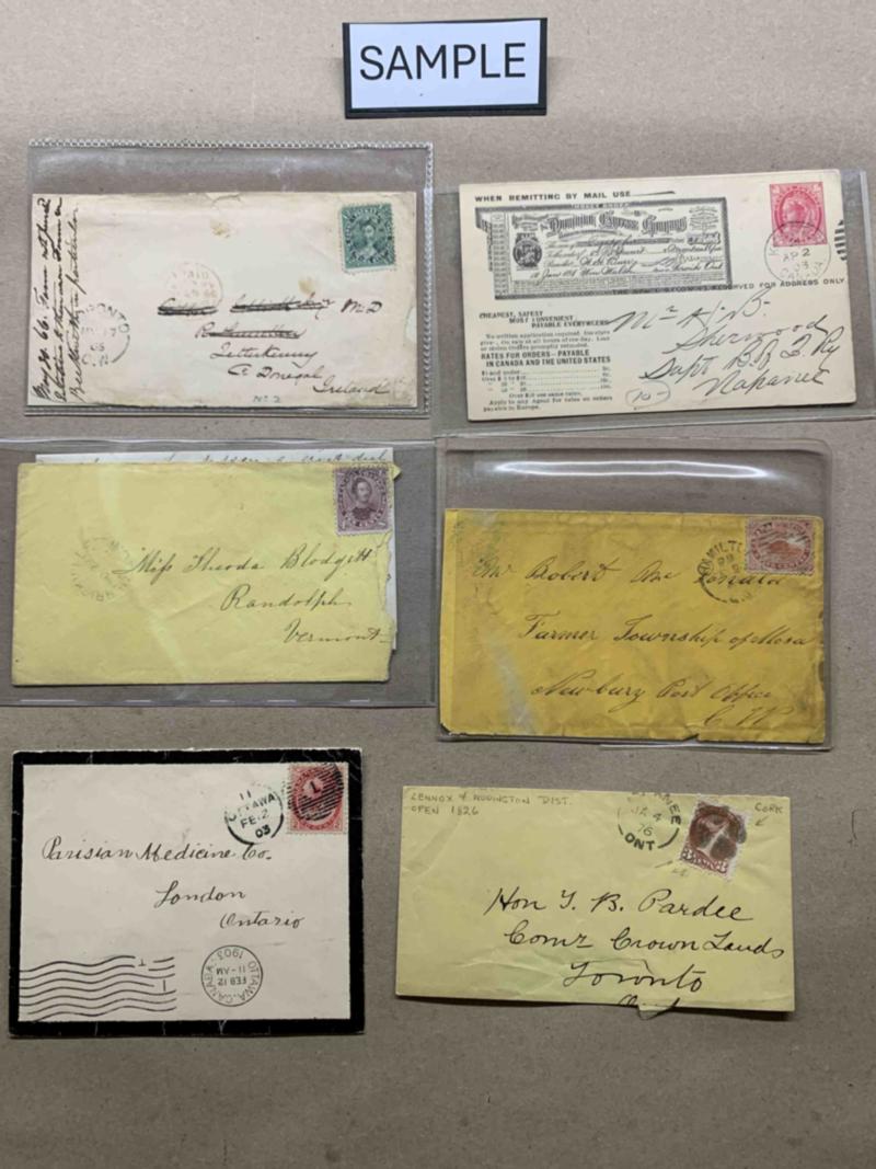 Hamilton, Ontario auxiliary markings collection, 44 covers and cards, most written up in detail on exhibit pages, spotted multiple variants of "Stamp Fallen Off", "Damaged by Stamping Machine...", "Received Unsealed...", "Received in Damaged Condition..", "Received Adhered to another letter at Hamilton, Canada", "Received without contents", "Received in third class matter", "Found in Unused Post office equipment", etc. Not all images shown. See more images in PDF. Click here for PDF.(Image)