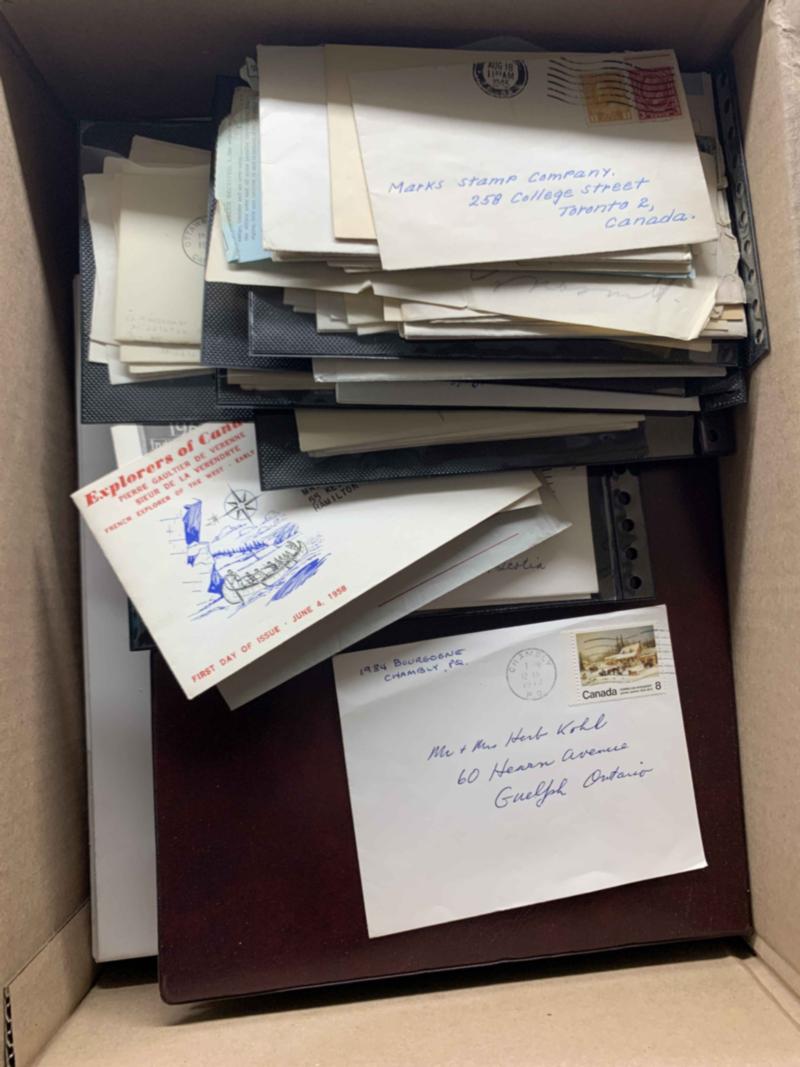 Canada cover carton with five binders (largely FDCs and inexpensive covers). Quantity makes up for quality. Worthwhile for show dealer, and not much of interest for a specialist. Spotted some Numeral issue covers (rough), and a small clutch of Newfoundland. Not all images shown. See more images in PDF. Click here for PDF.(Image)