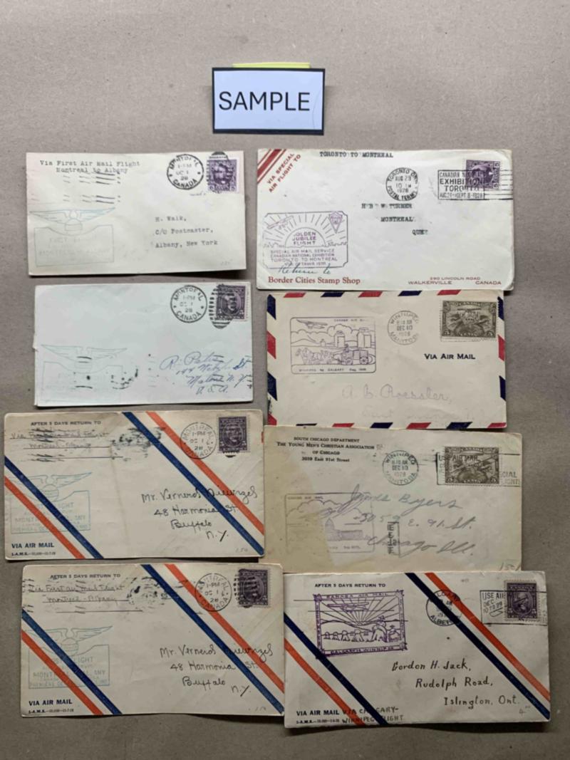 Canada cover carton over 1,000 covers incl. 149 FFCs and related incl. 65 FFCs from 1929-1933, 16 FFCs from 1920s/1930s incl. 4 Montreal to Albany, 20 FFCs 1939-1949, 21 misc airmail and 27 Malott Airmail anniversary, then 229 post Admiral George V covers and cards, 605 George VI covers, post cards and postal cards with some small towns, slogans etc. All images shown available as PDF. Click here for PDF.(Image)