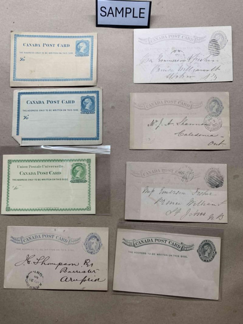 Box of Victorian postal stationery and postal history, 425 items incl. 32 Small Queen covers, 40 Squared circle covers, cards, 71 squared circle postmarks on stamp or piece, 11 leather postcards, 14 Jubilee postal cards, 60 P1 and P2 1c postal cards, plus 29 more. Leaf Numeral issue 42 covers, 10 fronts, 45 postal cards and then 143 other cards, mixed quality but interesting postmarks etc. All images shown available as PDF. Click here for PDF.(Image)