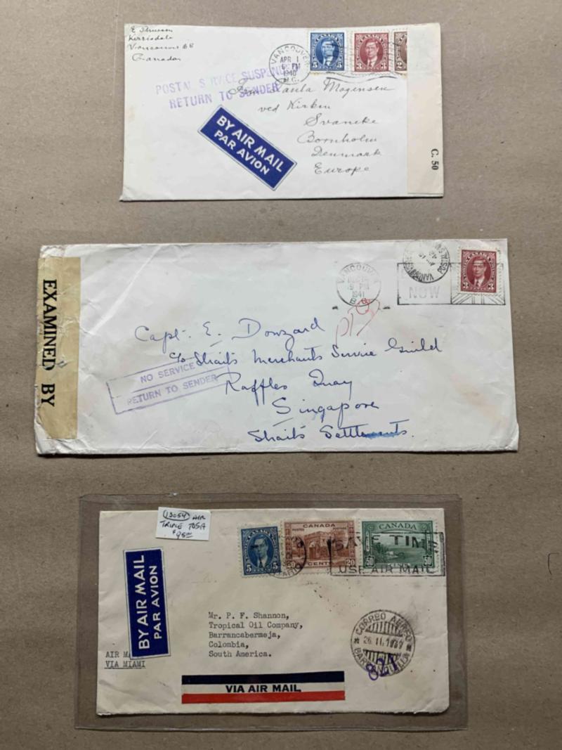 Mufti issue postal history group, 17 items incl. 1940 "POSTAL SERVICE SUSPENDED RETURN TO SENDER" to Denmark, 1941 "No Service Return to Sender" to Singapore, 1939 75¢ trip air to Colombia, 1937 Mailed at Sea, 1938 5¢ UPU to Norway, 1940 3¢ to Tasmania, censored, etc, plus more. Inspect. All images shown available as PDF. Click here for PDF.(Image)