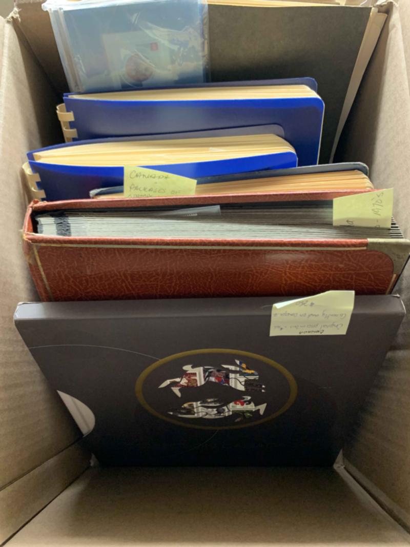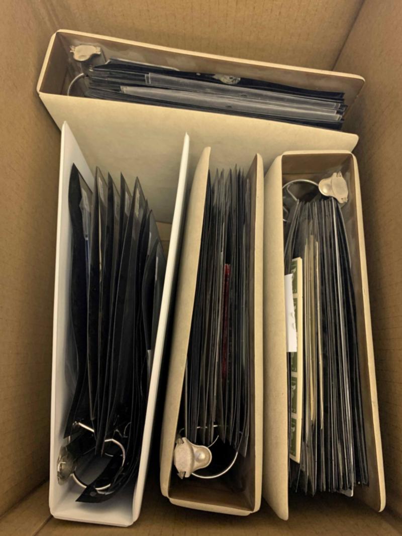 Wine carton with binders filled with cancels, pre-cancels, RPOs, slogans, Centennials and more. Not all images shown. See more images in PDF. Click here for PDF.(Image)