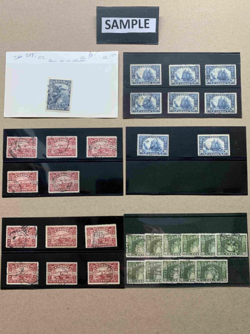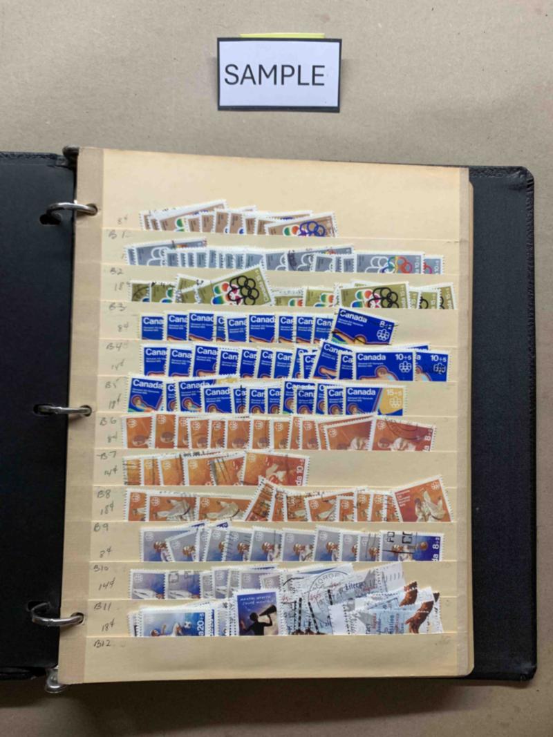 Canada used Back of Book dealer stock, binder with manila pages with extensive duplication, #B1/B30, C1/C9, E1/E11, MR1/7a, F1/F2, O1/O49, O9-231/O10-271, J1/J36a. All images shown available as PDF. Click here for PDF.(Image)