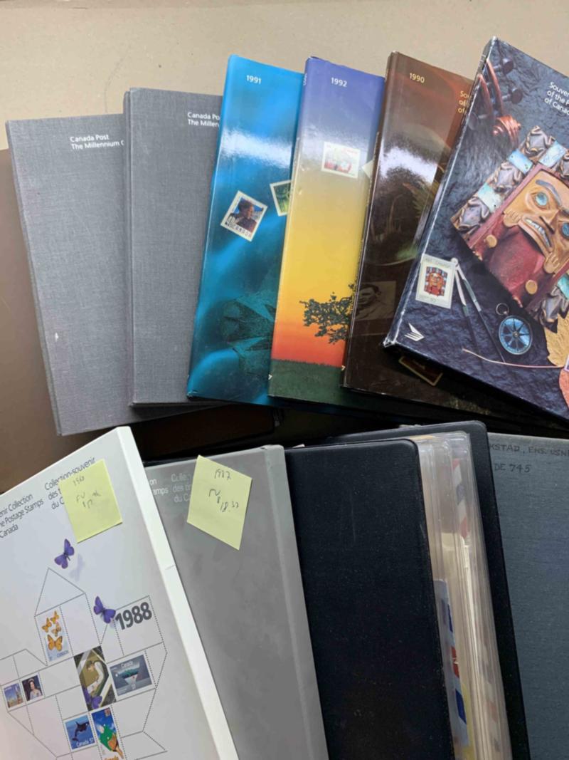 Canada horde in two cartons incl. 2011 annual set (cost $105), several binders with mint modern, incl. "P" stamps, souvenir sheets, set of "Write me, Ring Me" cards, pages of Newfoundland, tear sheets of Canada, stock books etc. Inspect. Not all images shown. See more images in PDF. Click here for PDF.(Image)