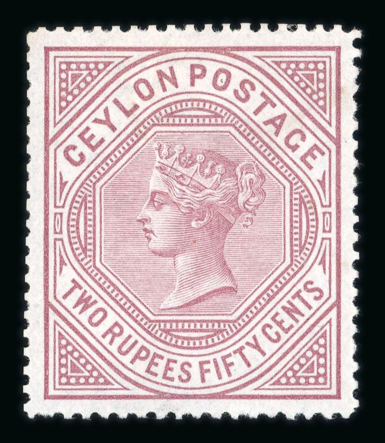 1872-1880 2r 50c dull rose, perforated 12 1/2, mint with full original gum and light hinge remnant, a very fine stamp with good colour and perfect centring, with some slightly trimmed perforations as is usual, a very rare stamp prepared for use but never issued without surcharge; cert. RPS (1952) (S.G. £3'750). (Image)