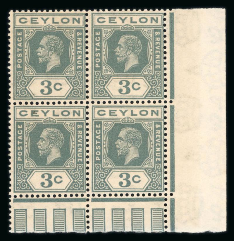 1921-1932 3c slate-grey, variety watermark sideways, block of four from lower right corner of upper right pane, with part inter-pane margin at foot, unmounted with full original gum; an extremely attractive block that leaves the watermark variety clearly visible in the right margin from the front, with some toning to gum, (SG £1700 for single stamp): mounted on SG stock card with the note "a major keyplate variety. We have handled no other examples (even singles) in the past 30 years, and no other block is known to us."; cert. BPA (2011). (Image)