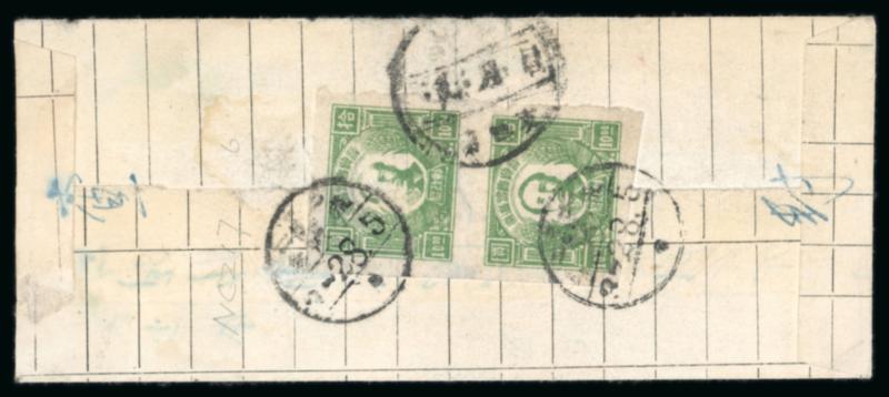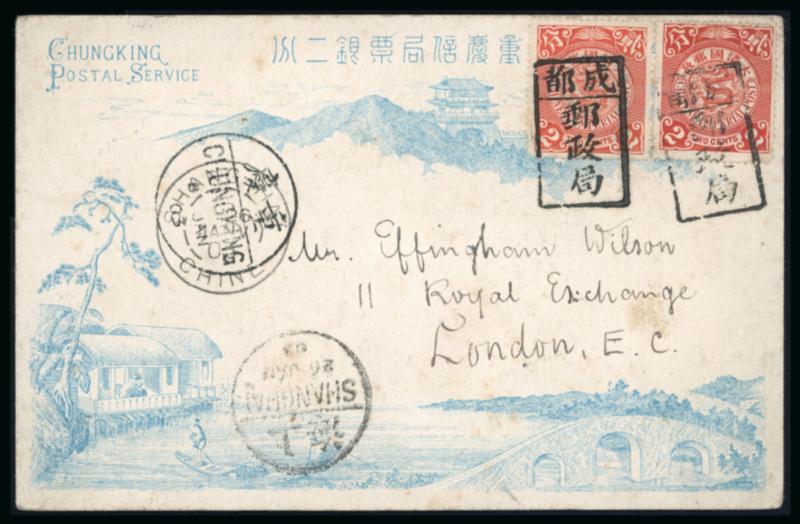 1902 (24 Dec) Chungking postal stationery card used with two 2c Coiling Dragons tied by good to superb framed Chungking framed handstamps, cds at left of 8 Jan 03 overstruck with French Shang-Hai Chine cds, Chinese Shanghai cds below, both of 26 Jan. Message written from renowned Chinese travel writer Mrs Archibald Little. Very fine and attractive. (Image)