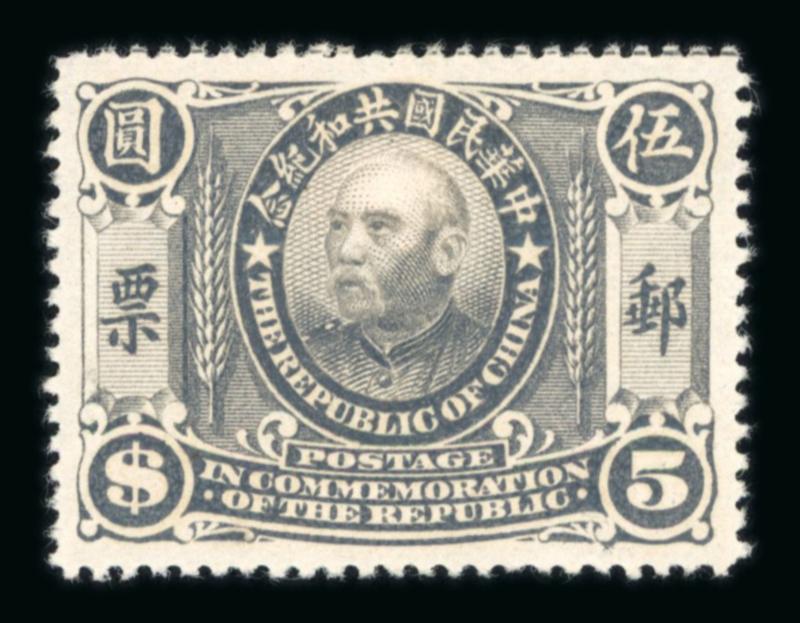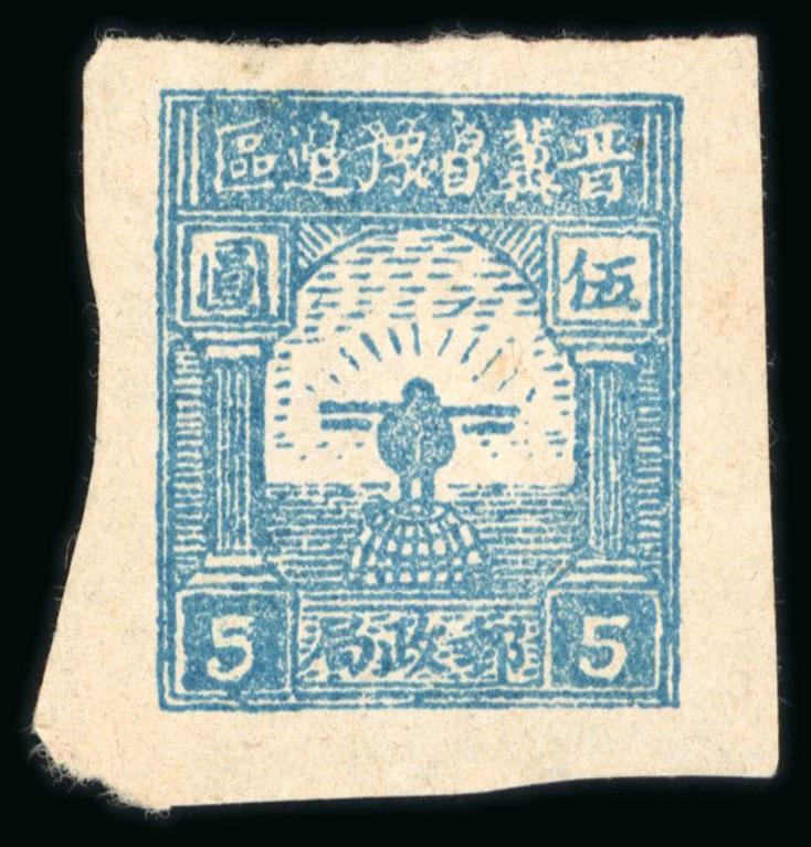 1946 North China, Shanxi-Hebei-Shandong-Henan Border Area, $5 dull-blue, two shades, unused without gum; fine and fresh copies. (Image)