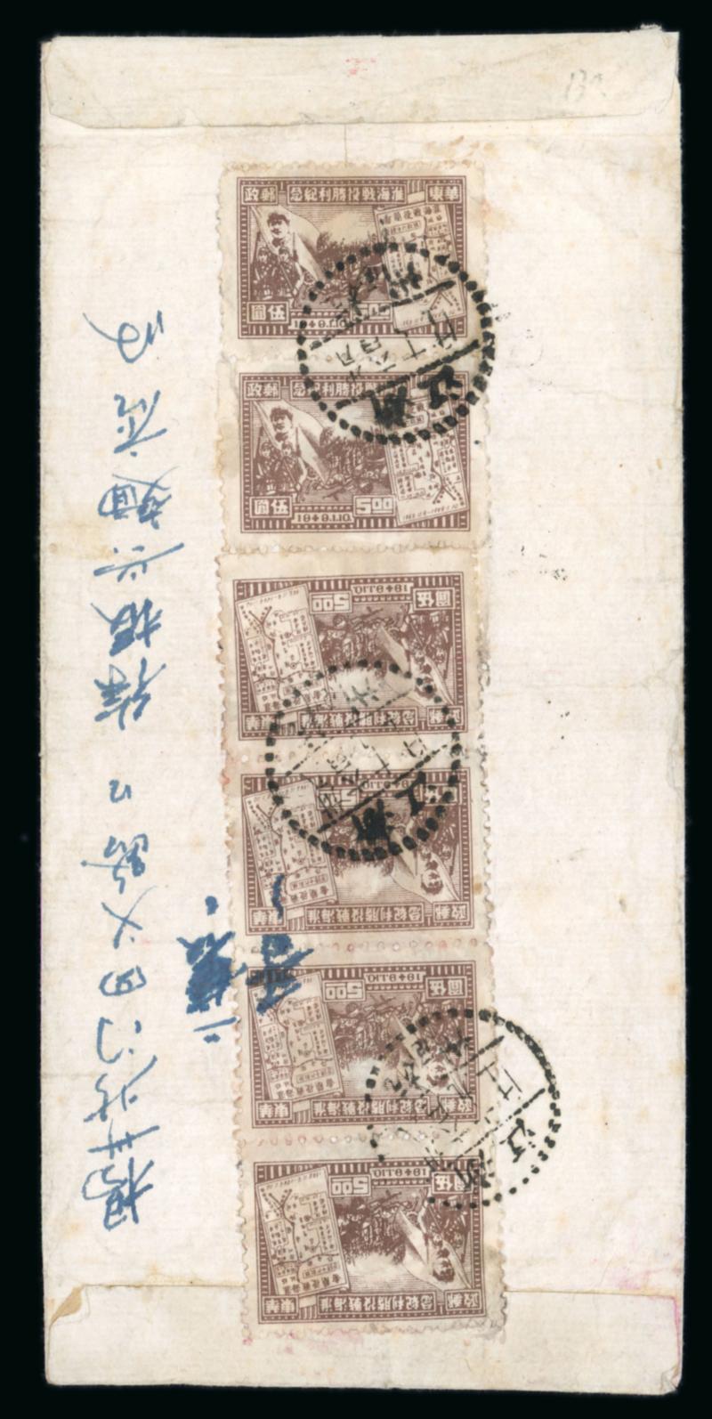 1949 East China, East China People’s Post, letter from Hangkow (North Kiangsu), pair and strip of four $5 SG EC336; fine and lightly creased cover. (Image)