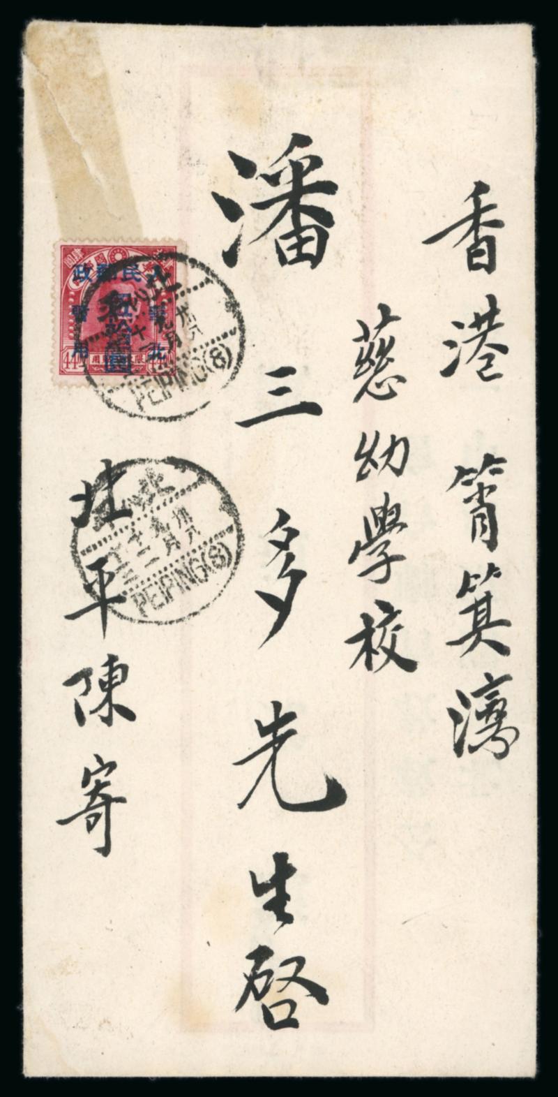 1949 (25.5.) red band envelope to Su-Kow franked on reverse 'People's Postal Service North China' $6 on $10 (3) and $2 on 20c tied by two cds, repeated on front, arrival cancel alongside, some staining and peripheral faults, a scarce local cover. (Image)