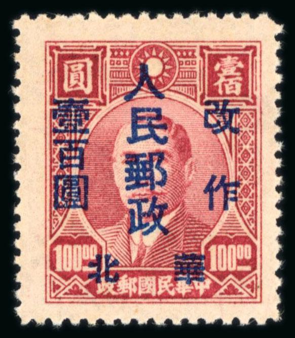 1949 North China, $3 on 2, unused (no gum), very fine post office fresh, a rare stamp in mint condition. (Image)