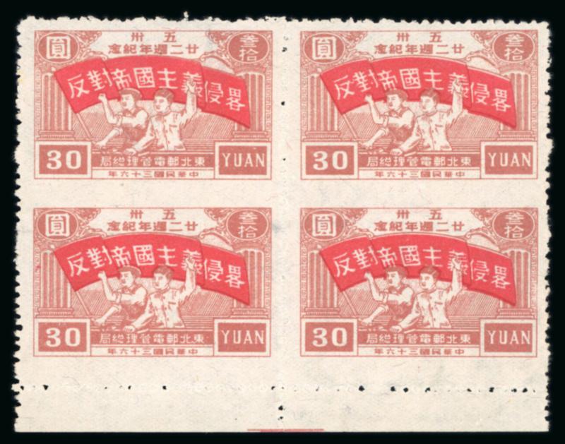 1947 North East China, $30, SG NE166a, block of four, vertically imperforate, unused (no gum); very fine and fresh block. (Image)